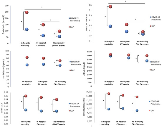 Differences in biomarker levels between CAP and COVID-19 pneumonia in patients who present in-hospital mortality, in-hospital cardiovascular events (CVE), or none of these events are represented in Figure 2. Significantly higher levels of endothelin and proADM were found in patients with in-hospital mortality and those with CVE; however, levels were more elevated in CAP patients compared to those with COVID-19 pneumonia. Patients with CAP who died during hospitalization had significantly higher levels of endothelial damage biomarkers (endothelin 246.20 [233.19, 296.60] vs. 110.80 [70.46, 194.70] pmol/L, p < 0.001; proADM 3.28 [2.60, 4.42] vs. 1.48 [1.22, 1.89] nmol/L, p = 0.010), CitH3 (0.160 [0.079, 0.183] vs. 0.080 [0.067, 0.095] AU, p = 0.009), and leukocytes (15,030 [7050, 28,110] vs. 6955 [5017, 9593] U/mL, p = 0.008), compared to patients with COVID-19. Patients with CAP who presented cardiovascular events during hospitalization had significantly higher levels of endothelin (148.10 [104.18, 213.61] vs. 62.05 [29.11, 194.58] pmol/L, p = 0.030), CitH3 (0.152 [0.071, 0.166] vs. 0.074 [0.062, 0.081] AU, p = 0.026), and leukocytes (14,150 [11,930, 15,950] vs. 7300 [5480, 9300] U/mL, p < 0.001), compared to patients with COVID-19. Patients with CAP who did not die or present CVE showed significantly higher levels of all the studied biomarkers compared to COVID-19.