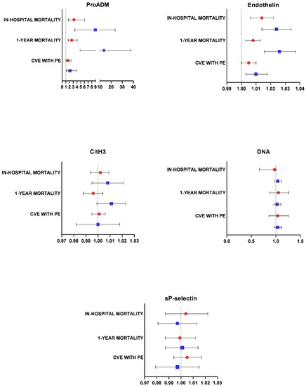 ProADM and endothelin were associated with in-hospital mortality, in-hospital CVE, and 1-year mortality from admission in both cohorts (COVID-19 and CAP), expressed in odds ratio (OR) and 95% CI (Figure 3).