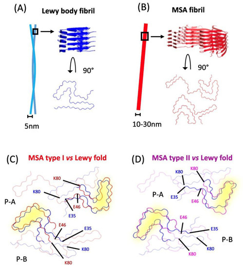 Structural differences between strains. (A) Fibrils in LBs are commonly associated in pairs, and stack on top of each other to form a twist, with a diameter of 5 nm. (B) Fibrils found in GCIs consist of α-synuclein dimers that can form a straight or twisted structure, with a diameter ranging from 10 to 30 nm (MSA type I dimers are shown as a generic example). (C,D) α-synuclein monomers found in MSA type I and II (Protein Data Bank (PDB) atomic model accession numbers: 6XYO & 6XYP), respectively, are superimposed to the Lewy body fold (PDB: 8A9L), displaying regions with structural similarities (highlighted in yellow). Key amino acid residues are labelled, showing that different interactions with the residue K80 are associated with either the LB or MSA folds [57,64].