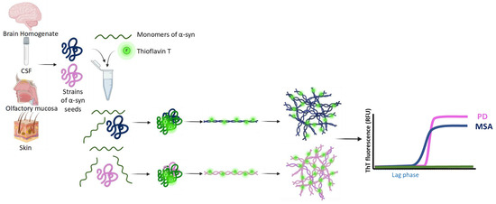 Scheme depicting the methodology for the amplification of α-syn seeds via seeding amplification assays (SAAs). A schematic illustrating the sources of seed-competent α-syn oligomers, which are combined with α-syn monomers and Thioflavin T (ThT) during SAAs. The α-syn seeds recruit the monomers, misfolding them, and encouraging them to aggregate into fibrillar structures. ThT fluorescence is recorded during the assay, resulting in a curve that is initially low in lieu (lag phase), but increases as misfolded α-syn monomers begin to aggregate (exponential phase) and, eventually, reaches a plateau. Evidence suggests that different strains of a-syn are likely to undergo this process, with variations in the seeding kinetics and terminal structures. The different α-syn strains present in MSA and PD display different seeding kinetics, with MSA α-syn aggregating faster, but reaching a lower plateau, in comparison to PD α-syn [29].