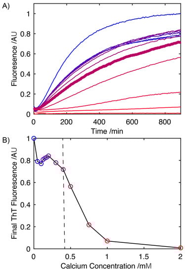 Influence of Ca2+ on the kinetics of S100A9 (3.3 mg mL−1) Thioflavin-T positive fibril formation in 20 mM Tris buffer (pH 7.2) (A). Fibril formation was monitored at 0, 0.05, 0.10, 0.125, 0.15, 0.175, 0.20, 0.30,0.40, 0.50, 0.75, 1.00 and 2.00 mM concentrations of Ca2+ ions (concentration of Ca2+ ions increasing from blue to red, with colouring matching the data points in (B)). The concentration at which S100A9 aggregation starts to be suppressed significantly by Ca2+, 0.4 mM is highlighted in bold (A). Corresponding plot of Thioflavin-T fluorescence at the plateau level after S100A9 incubated at 41 °C for 15 h, highlighting the drop in total amount of S100A9 fibrils formed as the Ca2+ concentration is increased (B). Vertical line (in (B)) represents the concentration at which the Ca2+ ions begin to supress the S100A9 aggregation (data point corresponds to the trace in bold in (A)).