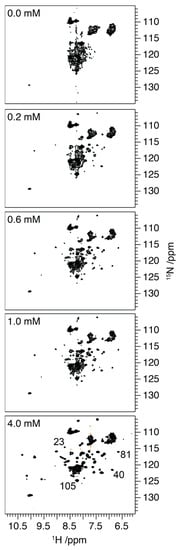Titration of the S100A9 with increasing concentrations of Ca2+ ions results in an increased chemical shift dispersion in both the 1H and 15N dimensions, indicative of a more well-defined and less conformationally flexible structure. The significant change in spectral dispersion arises between 0.4 and 0.6 mM of Ca2+ ions with further increases in dispersion as concentrations are increased from 1.0 to 4.0 mM. We attribute the increased chemical shift dispersion to the binding of Ca2+ to the two EF hands, and a reduction in the conformational plasticity, that is observed on the micro- to milli-second timescale in the absence of Ca2+. Comparison of the experimental 1H/15N HSQC with published assignments of S100A9 in the presence of Ca2+ reveals a similar chemical shift distribution indicating that the protein adopts a similar conformational state here to that published (Supplementary Figure S1) []. The C-terminal EF hand has been observed to exhibit a higher affinity for Ca2+ than the N-terminal domain [,], being saturated, and potentially more structured, at lower Ca2+ concentrations. Interestingly though the increase in chemical shift dispersion arising upon the addition of Ca2+ occurs through the ordering of the entire protein backbone, with representative resonances appearing from both the N and C terminal EF hands at Ca2+ concentrations as low as 0.4 mM (Figure 3 and Supplementary Figure S1). This suggests that the reduction in conformational plasticity occurs throughout the protein and does not arise through the sequential folding of specific motifs as may have been expected.