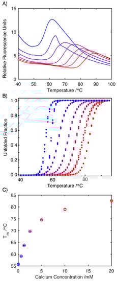 To assess if the decreased conformational flexibility observed by NMR was reflected in the stability of the protein, a differential scanning fluorimetry study was performed (Figure 4A). Fitting the data to a two-state folding model allowed the melting temperature, Tm, of the S100A9 to be determined under increasing concentrations of Ca2+ ions (Figure 4B). This analysis reveals that increasing Ca2+ concentrations result in a significant increase in the melting temperature, Tm, reflecting the increased stability of the protein. This observation mirrors earlier differential scanning calorimetry experiments, which also reported a significant increase in the melting temperature, Tm, upon the binding of Ca2+ to S100A9 []. Importantly, the cooperative two-state unfolding transition was observed also in the apo-form of S100A9, which corroborates the CD finding that the protein is structured but this structure is less stable in the absence of calcium.