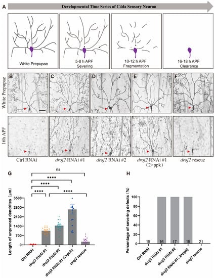 To systematically obtain insights into the molecular mechanisms that underlie neurite pruning, we conducted an unbiased RNAi screen, making use of a class IV da sensory neuron driver, pickpocket-Gal4 (ppk-Gal4), to attenuate gene function in the C4da neuron. From this screen, we isolated two independent RNAi lines, TH02998.N (#1) and BL57382 (#2), that were delineated by a prominent deficiency in dendrite pruning. Both the RNAi lines target the gene of droj2, a molecular chaperone homology with human DNAJA1 and DNAJA4, and the RNAi knockdown of droj2 consistently led to a pronounced deficit in dendrite pruning in C4da neurons at 16 h APF (Figure 1C,D,G,H). In contrast, dendrites were completely ablated in the control neurons at the same time point (Figure 1B,G,H). Likewise, knockdown with other droj2 RNAi lines, V104880 (#3) and V23637 (#4), also resulted in similar pruning defects at 16 h APF (Figure S1A–E). Moreover, the expression of the droj2 RNAi transgene (#1) with two copies of ppk-Gal4 drivers caused more severe deficiencies with a residual with an average dendritic length of 2650 μm at 16 h APF (Figure 1E,G,H). In an attempt to further shed light on the crucial role of Droj2 in neurite pruning, we next constructed a transgene using the UASt promoter for the high-level expression of Droj2 in C4da neurons. Throughout our experiments, we observed that the residual dendrite branches in droj2 RNAi neurons were substantially eliminated via the reintroduction of UAS-Droj2 at 16 h APF (Figure 1F–H). Additionally, we examined the transcription level of droj2 via RT-PCR (Reverse Transcription-Polymerase Chain Reaction), and UAS-Droj2 overexpression, to some extent, enhances the gene expression of droj2 in Droj2 RNAi (Figure S2). In summary, these results systematically indicate that Droj2 plays a novel and pivotal role in the regulation of dendrite remodeling of Drosophila somatosensory neurons.