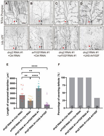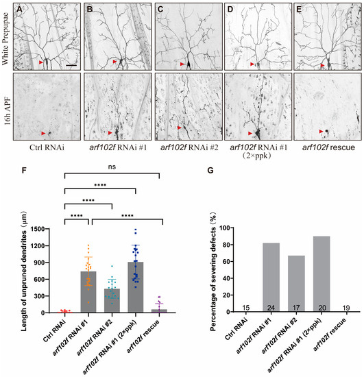 As Droj2 is predicted to be involved in protein-refolding, it is likely that this process involves downstream-regulated proteins that are also required for the dendrite pruning of Drosophila C4da sensory neurons. In order to identify the downstream target of Droj2 in neurite remodeling, we performed another round of RNAi screening with our collection of RNAi lines based on the genes that might be correlated with Droj2 according to the FlyBase database. Eventually, we isolated another two independent RNAi lines, BL27268 (#1) and V12931 (#2), which displayed dendrite pruning deficiencies. Both RNAi lines correspond to the same gene, arf102f, which encodes a GTP-binding protein involved in protein trafficking. The known functions of Arf102F include the intracellular regulation of vesicle budding and uncoating within the Golgi apparatus and sustaining the integrity of the Golgi structure [40,41,42]. Unexpectedly, database searches also implied that Droj2 might govern protein processing, including Arf102F [44]. We thus asked whether Arf102F is also involved in the regulation of the dendrite pruning of C4da neurons. RNAi knockdown of arf102f via ppk-Gal4 was found to lead to deficits in dendrite pruning at 16 h APF. By contrast, all larval dendrites were completely removed in the control RNAi neurons at this time point (control-0%, RNAi #1–82%, and RNAi #2–67%; Figure 2A–C,F,G). In order to confirm this result, we used another independent RNAi, THU2594 (#3), and a p-element insertion allele, arf102fc339, and our data showed that these mutant clones exhibited consistent dendrite pruning defects, whereas wild-type neurons completely pruned their larval dendrites at 16 h APF (Figure S3A–E). To further ascertain the requirement of Arf102F in dendrite pruning, we then integrated UAS-arf102f RNAi with ppk-Gal4 in the same fly and expressed double copies of UAS-arf102f RNAi with double copies of ppk driver. As a consequence, the length of uncleared dendrites and the percentages of severing defects in C4da neurons were further enhanced to approximately 909 μm and 90%, respectively. (Figure 2D,F,G). To verify that the deficit in dendrite pruning resulting from the expression of UAS-arf102f RNAi was not an off-target effect, we conducted a rescue experiment. We attempted to alleviate the phenotypic defects by overexpressing UAS-Arf102F. Unambiguously, UAS-Arf102F expressed in C4da neurons substantially ameliorated the dendrite pruning deficiencies against a background of Arf102F knockdown. Indeed, none of the C4da neurons had attached dendrites and only an average 61 μm dendritic length residual at 16h APF when UAS-arf102f RNAi was co-expressed with UAS-Arf102F (Figure 2E–G). Taken together, these results collectively underscore the importance of Arf102F in the neurite remodeling of C4da neurons.