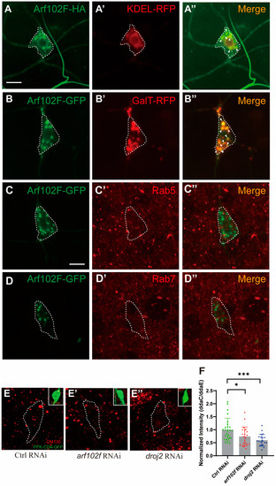 A previous study has illustrated that Arf102F is involved in the regulation of vesicle budding and uncoating within the Golgi apparatus [40]. To characterize the subcellular localization of Arf102F, we then attempted to investigate whether Arf102F localizes on the ER or Golgi, serving as a constituent to sustain their integrity. To this end, we expressed Arf102F-HA and Arf102F-GFP under the control of the ppk-Gal4 driver to assay the distribution, and Arf102F-HA and Arf102F-GFP were shown to contain numerous discrete punctate structures (Figure 4A–D). To further gain insight into the identity of these punctate structures, we co-expressed Arf102F-HA with the ER marker (KDEL-RFP) and Arf102F-GFP with the Golgi marker (GalT-RFP). We observed that Arf102F was co-localized, to some extent, with the ER apparatus (Figure 4A–A’’). However, a more striking co-localization was revealed between Arf102F and Golgi-RFP-positive puncta (Figure 4B–B’’). Given that both the secretory and endocytosis pathways are required to control neurite clearance during the metamorphosis of Drosophila, we next sought to determine whether Arf102F is also involved in the Rab5/ESCRT-mediated endolysosomal process. However, the Arf102F-HA punctate pattern did not overlap with those of the early endosomal marker Rab5 (Figure 4C–C’’) or the late endosomal marker Rab7 (Figure 4D–D’’). Therefore, our findings indicate that Arf102F is predominantly localized on Golgi and partly on ER.