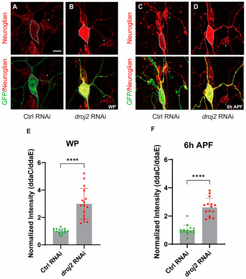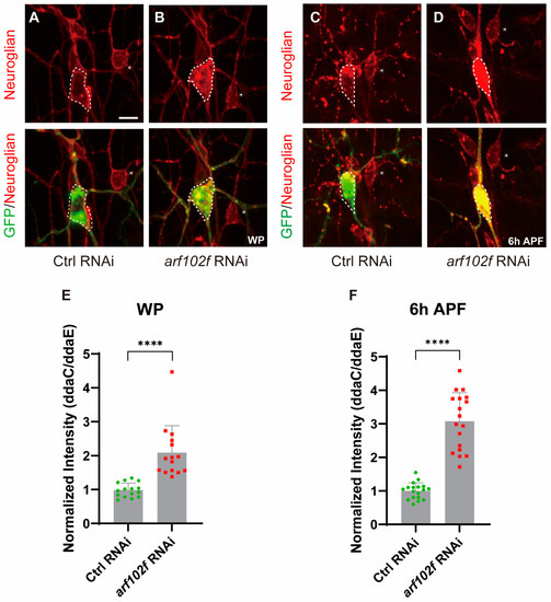 As Arf102F has been suggested to control the vesicle budding and uncoating of the Golgi apparatus, we, therefore, wanted to know whether Droj2 and Arf102F are involved in the protein redistribution of Neuroglian. Firstly, in an attempt to determine Neuroglian distribution in Arf102F-attenuated neurons, we expressed RNAi via ppk-Gal4 to knock down Arf102F in C4da neurons. Intriguingly, we observed a 2.1-fold enhancement in Neuroglian levels, as detected by the BP104 antibody, when compared to the wild-type in the WP phase (Figure 5A,B,E). More strikingly, the protein level of Neuroglian was increased by over threefold in arf102f RNAi neurons at 6 h APF (Figure 5C,D,F). Next, we interrogated whether Droj2 also contributes to maintaining normal Neuroglian levels in C4da neurons during the development of Drosophila. At the WP stage, we isolated Droj2, which, when compromised by RNAi, led to a drastic augmentation of Neuroglian intensity in C4da neurons in contrast to controls (Figure 6A,B,E). To further verify the role of Droj2 in Neuroglian regulation, we also investigated the distribution of Neuroglian at 6 h APF, and our data showed that the ablation of Droj2 resulted in a remarkable accumulation of Neuroglian in the soma of C4da neurons (Figure 6C,D,F). Subsequently, we asked whether Arf102F works downstream of Droj2 to regulate Neuroglian levels. We overexpressed Arf102F in droj2 RNAi and Droj2 in arf102f RNAi neurons at the WP stage, respectively. Our results showed that Arf102F overexpression can partially rescue the Nrg defect in Droj2 downregulated neurons, whereas induction of Droj2 is unable to ameliorate the Nrg defect in Arf102F downregulated neurons (Figure S6A–D). These data collectively reveal the indispensable role of Droj2 and Arf102F in the developmental downregulation of the neuronal membrane protein Neuroglian at the onset of the pupal stage.