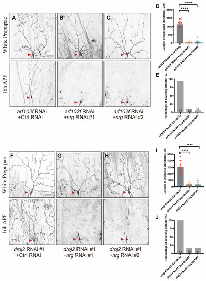 In order to ascertain whether Droj2 and Arf102F’s promotion of dendrite pruning can indeed be attributed to aberrant Neuroglian accumulation, we first knocked down Neuroglian, via two independent neuroglian RNAi transgenes, BL38215 (#1) and BL37496 (#2), in Arf102F RNAi-expressing C4da sensory neurons. Notably, the expression of two independent neuroglian RNAi transgenes, which has been shown to efficiently knock down Neuroglian [35,37], drastically rescued the neurite pruning phenotype in arf102f RNAi C4da sensory neurons (Figure 7A–E), supporting the idea that, analogous to Rab5, Arf1/Sec71, and Raw [34,35,37], Arf102F contributes to the endocytosis and degradation of Neuroglian to facilitate neurite pruning. Analogously, the knockdown of Neuroglian, via these two RNAi lines, also significantly suppressed the neurite pruning deficiency in Droj2-compromised neurons (Figure 7F–J). Overall, our data uncover an unprecedented function of Droj2 and Arf102F: developmentally facilitating the downregulation of Neuroglian prior to the neurite pruning of C4da sensory neurons.