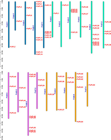 A total of 65 FaPL genes were identified by searching and confirming the conserved PL domains (PF00544) in the genome of cultivated strawberry. According to their distribution order on chromosomes, all the 65 FaPL genes were renamed as FaPL1 to FaPL65 (Figure 1). The sixty-five FaPL genes were unevenly distributed across the twenty-eight chromosomes in the four subgenomes of cultivated strawberry, with an apparent concentration on the chromosome 6. A maximum of seven FaPL genes were located on chromosome 6 from the first, second, and third subgenomes (Fvb6-1, Fvb6-2, Fvb6-3), while the minimum number was 1 on chromosomes Fvb3-1, Fvb2-2, Fvb3-2, Fvb2-4, and Fvb7-4. However, there were no FaPL genes on chromosomes 1 and 2 from the first subgenome (Fvb1-1, Fvb2-1), chromosome 2 from the second subgenome (Fvb2-2), chromosomes 1, 2, and 3 from the third genome (Fvb1-3, Fvb2-3 and Fvb3-3), and chromosomes 1 and 3 from the fourth subgenome (Fvb1-4 and Fvb3-4), which is not shown.