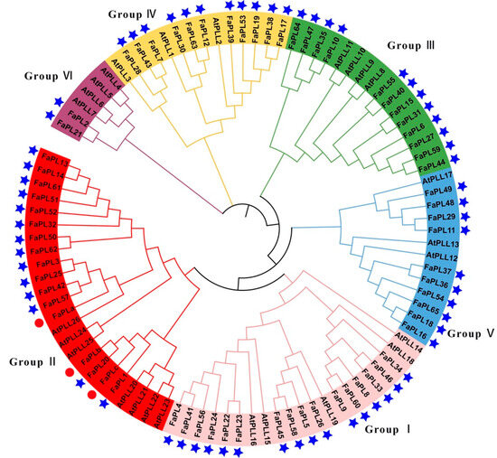 Phylogenetic tree of FaPLs from strawberry and Arabidopsis. Different branch colors represent the different groups. PL family members from strawberry identified in this study are marked with blue stars. The red dots indicate the previously reported FaPLs.