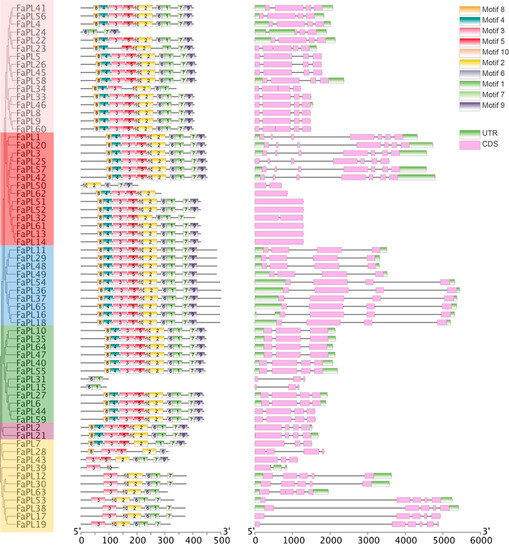 Conserved motifs and gene structure analysis of FaPLs. Left part indicated an unroot tree of strawberry FaPLs, middle part displayed the distribution of conserved motifs on each FaPL protein, and the right part showed the exon–intron distribution of FaPLs.