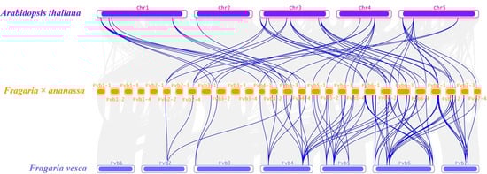 Collinearity analysis of PL genes among Arabidopsis thaliana, Fragaria × ananassa, and Fragaria vesca genomes. Grey lines indicate collinear blocks within the three genomes, while the blue lines represent collinear PL gene pairs. The purple, yellow, and blue columns indicate the chromosomes from Arabidopsis thaliana, Fragaria × ananassa, and Fragaria vesca genomes, respectively. Chromosome numbers are displayed at the side of chromosomes.