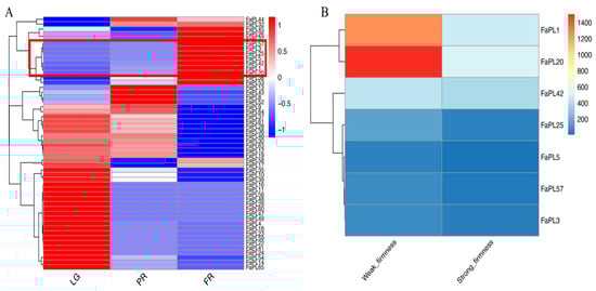 To identify the FaPLs related to strawberry fruit ripening, their expression patterns during fruit development were examined based on transcriptome data. As shown in Figure 5A, 52 out of 65 FaPLs distinctly expressed during the fruit development. Interestingly, most FaPL genes were highly expressed in the large green (LG) stage, while barely expressed in the partial red (PR) and full red (FR) stages. On the contrary, there were seven FaPLs (FaPL1, FaPL3, FaPL5, FaPL20, FaPL25, FaPL42, FaPL57) that exhibited lower expressions in the LG stage and gradually increased as the fruit ripened, indicating that they may be associated with strawberry fruit ripening. Subsequently, the expressions of these seven FaPLs were further assessed in fruit in comparison with firmness. As a result (Figure 5B), all of them had much higher expression levels in fruit with weak firmness than that in fruit with strong firmness, confirming their potential role in strawberry fruit softening. The transcriptome FPKM values are listed in Supplementary Table S3.