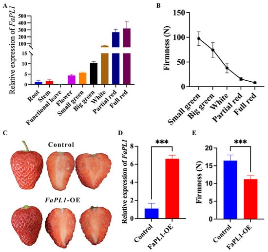 qRT-PCR based expression analysis and overexpression of FaPL1 in strawberry. (A) The expression patterns of FaPL1 in different tissues and during fruit development and ripening. (B) The change of fruit firmness of strawberry. (C) The phenotype of strawberry injected with empty (control) and FaPL1-overexpressing recombinant plasmid. (D) The relative expression of FaPL1 in the full red FaPL1-overexpressed fruit and control fruit. (E) The firmness of full red FaPL1-overexpressed fruit and control fruit. OE, overexpressing. Triple asterisk indicated statistical difference at p ≤ 0.001 level.