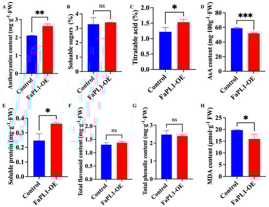 The effects of FaPL1 overexpressing on the ripening-related traits. (A–H) indicate total anthocyanins content, soluble sugar, titratable acidity, AsA, soluble protein, total flavonoid, phenolic, and MDA content, respectively. Single, double, and triple asterisks indicate statistical differences at p ≤ 0.05, 0.01, and 0.001 levels. ns, no significant difference was found.