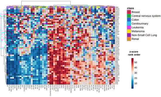 Mining NCI-60 cell line treatments revealed 51 chemical agents with an alkylating mechanism as defined by Cellminer. This included agents broadly defined as alkylating agents, as well as those that were specifically characterized as alkylating N-2, O-6, and N-7 positions of guanine residues (Supplemental Table S1). After converting z-scores to rank orders for each test compound, a clustering heatmap was generated using MetaboAnalyst (Figure 1). The unsupervised clustering of cell lines did not clearly indicate that sensitivity profiles to alkylating agents were driven by tissue type, although some tissue types such as leukemia and central nervous system cell lines tended to favor the lower z-score rank orders, indicating more sensitivity to these compounds.