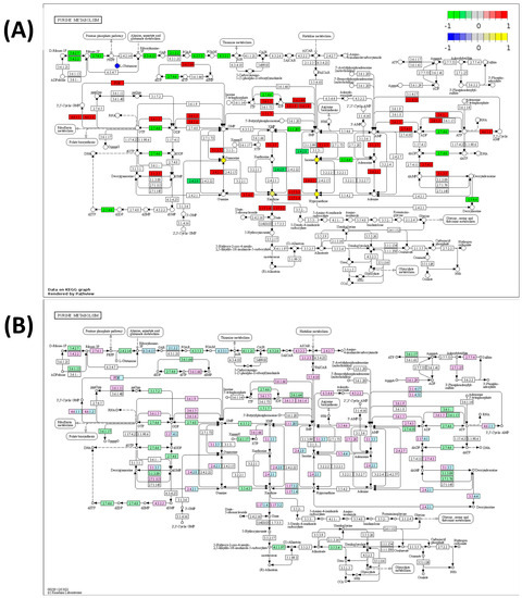 - Luo, W.; Brouwer, C. Pathview: An R/Bioconductor package for pathway-based data integration and visualization. Bioinformatics 2013, 29, 1830–1831. [Google Scholar] [CrossRef] [PubMed]
