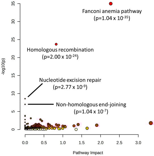 Pathway analysis of genes identified as hits for determining sensitivity to alkylating agents in the Biological General Repository for Interaction Datasets (BioGRID) Open Repository of CRISPR Screens (ORCS). Red points on the graph indicate a more significant pathway p-value.