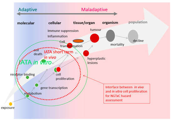 Conceptual overview of the adaptive vs. maladaptive critical data gaps for adverse outcome recognition in NGTxC, and how they can now be overcome using the cell proliferation tools [29]. From adaptive to maladaptive disease progression: key data gaps in the testing and assessment of non-genotoxic carcinogenicity (updated from [29,30]). There are numerous in vitro assays to address the early key events from receptor binding and transactivation, gene transcription, metabolism, and cell proliferation (indicated by the green circle). However, the in vitro cell proliferation assays require further optimization (discussed in Section 2.3), and thus the currently more optimum in vivo cell proliferation tools (discussed in Section 2.2) will need to be utilized in the short-to-medium term and can support the evidence-based shift to in vitro tools in the longer term. A change in morphology represents the point at which adaptive (sustained) proliferation and hyperplasia/dysplasia become maladaptive. Cell proliferation is a key event that is universal to all non-genotoxic pathways known today, and hence an important component of an IATA.