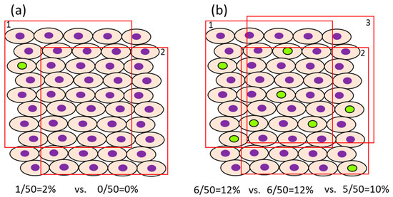 - In case the proliferation rate of the target cells is fast, it may be possible to reduce the number of cells that need to be counted. For example, in the normal colon of rats injected i.p. with BrdU 1 or 2 h before sacrifice, approximately 4.1–6.7/pit [54] or 12.8–15.8% [55] were positive, respectively, when they were counted in 12 or 10 crypts. The number of cells, as a denominator of the evaluation, differs between organs/cells with rapid cell proliferation (e.g., intestine) and those with slow cell proliferation (e.g., liver and bladder) [32]. For example, the ratio of BrdU-positive cells in the normal liver and bladder of rats injected i.p. with BrdU 1 h before sacrifice is about 0.28–0.48% [54] and 0.06–0.32% [54,56], respectively. In such cases, for sufficient statistical power, at least 1000–3000 cells should be evaluated for comparison. The impact of the error in the number of positive cells depending on the selection of view may become small if the number of positive cells is high. However, when the ratio of positive cells is low, fewer counts will result in a greater error due to the difference depending on the field of view (Figure 2). Also, to avoid selection bias, it is recommended that the slides be coded so that the individual counting the cells is blinded to the group the sample is from. The evaluation fields should be as similar as possible with respect to histological location.