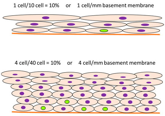 - In some cases, the cell proliferation rate is transiently induced in the initial period of administration of the test chemical, and the labeling rate increases, after which the proliferation ratio returns to normal levels. However, an increase in cell number results in an increase in the denominator, and the number of proliferating cells is still high even though the labeling rate looks decreased. For example, the meaning may be different between 10% positive normal-looking urothelial cells in three layers and 10% positive urothelial cells in six layers due to simple hyperplasia with increased cell density. In that case, the number of positive cells per unit basement membrane length is more than doubled and may be of different significance (Figure 6).