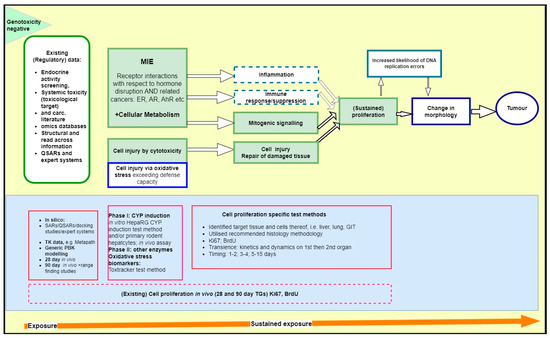 In 2020, an expert group of the Organization for Economic Cooperation and Development (OECD) developing an integrated approach for the testing and assessment (IATA) for non-genotoxic carcinogens (NGTxC) published a consensus paper [29] describing the overarching IATA, with the molecular initiating events (MIE) of cellular metabolism and receptor interactions, followed by the early key events of inflammation, immune dysfunction, mitotic signaling, or cell injury, leading to (sustained) proliferation, and then morphological transformation leading to tumor formation (Figure 1).