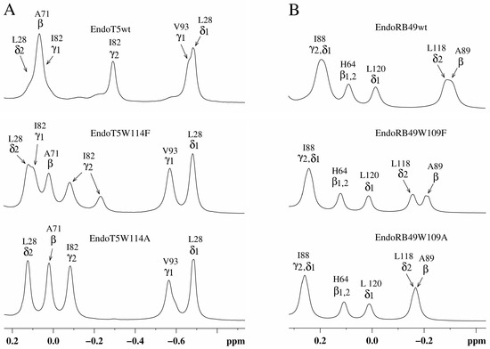 Upfield regions of aliphatic parts of 1H NMR spectra of EndoT5(Zn2+Ca2+) and EndoRB49(Zn2+) protein forms. (A) EndoT5wt and its mutants EndoT5W114F and EndoT5W114A; (B) EndoRB49wt and its mutants Endo RB49W109F and Endo RB49W109A.