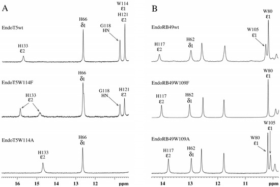 Downfield regions of aromatic parts of 1H NMR spectra of EndoT5(Zn2+Ca2+) and EndoRB49(Zn2+) protein forms. (A) EndoT5wt and its mutants EndoT5W114F and EndoT5W114A. (B) EndoRB49wt and its mutants Endo RB49W109F and Endo RB49W109A.