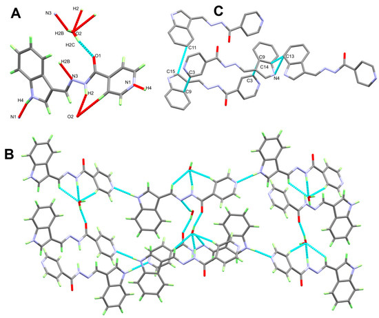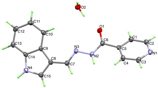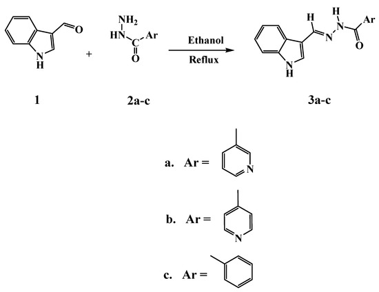 The investigated acid hydrazides were synthesized according to Scheme 1. The condensation reaction of the indole-3-carbaldehyde (1) and the molar equivalent appropriate acid hydrazide (2a–c) (nicotinic acid hydrazide, isonicotinic acid hydrazide, and benzoic acid hydrazide) afforded the corresponding hydrazones (3a–c) in good yields (61−81%). The structure of the investigated compounds was confirmed by the spectral data. The 1H NMR showed the presence of NH groups as four singles at the chemical shift of 11.5 ppm. Moreover, the carbonyl groups were approved in terms of the stretching vibration at 1640−1648 cm−1.