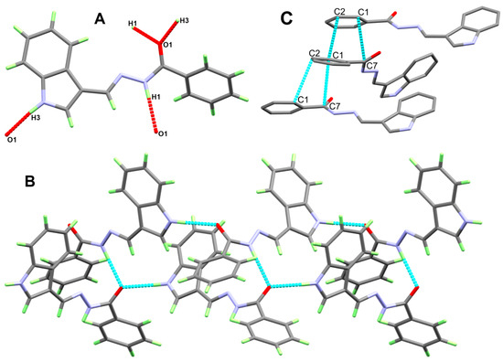 The supramolecular structure of 3c is controlled by strong N-H…O hydrogen bond contacts, as presented in Figure 4A. The hydrogen bond parameters are listed in Table 4 while the packing scheme via N1-H1…O3 and N3-H3…O3 is shown in Figure 4B. The donor (N1 and N3) to acceptor (O3) distances are 2.8827(11) and 2.8304(11) Å, respectively while the O3…H1 and O3…H3 distances are 1.981(15) and 1.936(16) Å, respectively. In addition, the packing is further controlled by some π−π stacking interactions shown in Figure 4C. The C1…C7 (3.353(1) Å) and C1…C2 (3.323(1) Å) contacts are the shortest π−π contacts.