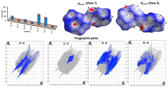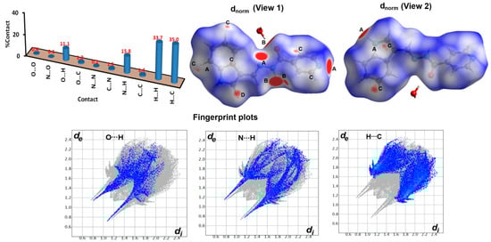The molecular packing of 3c is further investigated by using Hirshfeld calculations in order to shed light on all possible intermolecular contacts in its crystal structure. All possible contacts between molecular units along with their percentages are presented in Figure 5. The most common contacts are H…H (41.5%), H…C (33.3%), and O…H (12.0%) interactions. Other minor contact such as N…H (8.0%) and C…C (2.5%) interactions are also significant in the molecular packing of 3c. The red spots in the dnorm are related to short intermolecular interactions, which are considered the most significant and also shorter than the van der Waals radius sum of the two atoms. The corresponding fingerprint plots shown in Figure 5 have the characteristic sharp spikes which are considered as another evidence for the short contacts. These contacts and their corresponding distances are listed in Table 5.