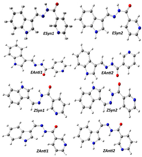 All DFT calculations for the indole-hydrazones were performed using Gaussian 09 software [35,36]. All calculations were performed with the B3LYP method and 6-31G(d,p) basis sets. The geometries were optimized and vibrational spectrum calculations revealed no imaginary frequencies.