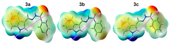 The charges at the different atomic sites of the most stable isomer (ESyn) were calculated based on natural population analysis and the results are presented in Table 9. For 3b, the O22 (−0.603), N21 (−0.550), N20 (−0.446), and N32 (−0.440) atoms have the most negative charge, in agreement with the highly electronegative nature of the N and O-atoms. In contrast, the C3 (0.678), H17 (0.442), and H4 (0.403) atoms have the most positive charge, as these sites are directly attached to atomic sites with high electronegativity. Similarly for compound 3c, the natural charge analysis indicated the high electronegative character of the carbonyl oxygen and amine nitrogen atoms. The highest negative charges are related to O22, N21, N20, and N32 which have natural charges of −0.611, −0.550, −0.446, and −0.446, respectively. As a result, the C3, H17, and H4 atoms have the highest positive charges of 0.677, 0.442, and 0.403, respectively. The corresponding charges of the electronegative atoms in the case of 3a are −0.611 (O22), −0.550 (N21), −0.446 (N20), and −0.446 (N32) while the charges of the electropositive atoms C3, H17, and H4 are 0.677, 0.442, and 0.403, respectively. On the other hand, presentation of the different charged regions is shown in Figure 9. The molecular electrostatic potential (MEP) maps revealed with no doubt the high negative electron density related to the carbonyl oxygen atom, as indicated by the dark intense red color close to it. The dark blue areas related to the NH protons indicate the high positive charge density related to these sites. As a result of the different charged regions in the studied systems, the compounds 3a, 3b, and 3c showed high polarity, as indicated from the high dipole moment values of 4.0533, 5.7234, and 5.3099 Debye, respectively.
