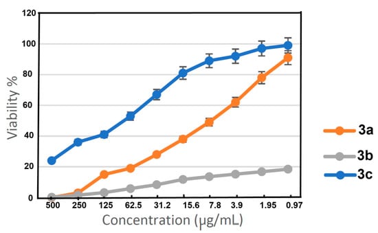 The in vitro cytotoxic effects of 3a, 3b, and 3c were tested using a human lung fibroblast cell line (WI-38). The results are presented graphically in Figure 10. It was found that the fibroblast cell viability percentages were 41.0, 15.0, and 3.2% at 125 μg/mL for compounds 3c, 3a, and 3b, respectively. Their IC50 values were 164, 48.25, and 11.03, respectively.