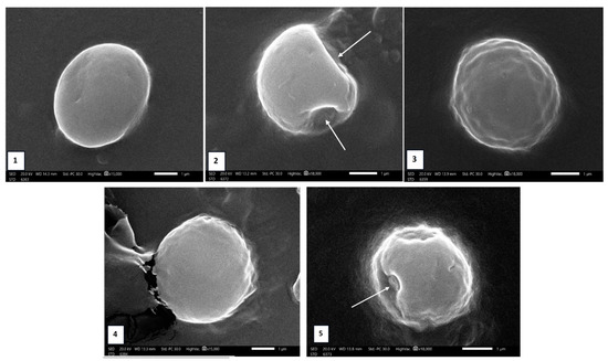 The ultrastructural morphological features of T. gondii cysts in the mice brain homogenate for each studied group were evaluated using SEM. T. gondii cysts from the control group II seemed as regular spherical-shaped cysts with a regular cyst surface while cysts recovered from treated mice revealed variable degrees of morphological changes (Figure 11).