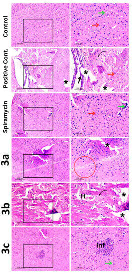 Light microscopic examination of H&E cerebral cortex-stained tissues of mice. Control group showed normal blood vessel (green arrow); normal neuron (red arrow). Positive control group showed necrotic gaps (black stars); lymphocytes (black arrow); fibrosis (bent black arrow); small neurons (red arrow). Spiramycin treated group showed normal neurons (red arrow); dilated blood vessel (green arrow). Treated group 3a showed necrotic gap (black star); decrease neurons number (red circle). Treated group 3b showed hemorrhagic blood vessel (H); fibrosis (black bent arrow); many necrotic gaps (black stars). Treated group 3c showed normal neuron (green arrow) some signs of inflammation (Inf). Magnification ×(200, 100).