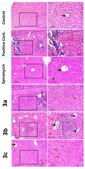Light microscopic examination of H&E liver stained tissues of mice. Control group showed normal central vein (black arrow) with surrounding normal hepatocytes. Positive control group showed congested blood sinusoids (red arrows); degenerated hepatocytes (red stars); inflammation and congestion of portal triad (red circle). Spiramycin treated group showed normal central vein (black arrow) with few ballooned hepatocytes (black head arrow). Treated group 3a showed congested blood sinusoids (red arrow); inflammation (red circle). Treated group 3b showed many congested and dilated central veins (black arrows); congested blood sinusoids (red arrow); edema (green circle). Treated group 3c showed normal central vein (black arrow); degeneration (red circle) showed congested blood sinusoids (red arrow). Magnification ×(200, 100).