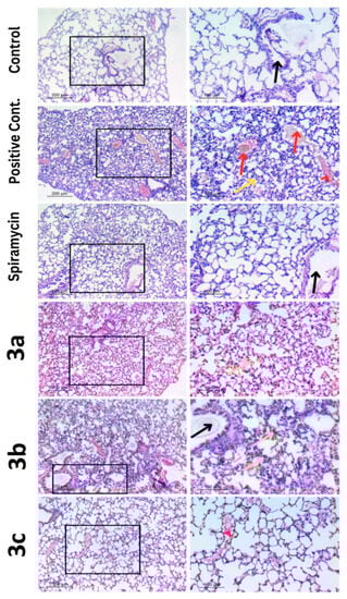 Light microscopic examination of H&E lung stained tissues of mice. Control group showed normal terminal bronchiole (black arrow) with surrounding normal Alveoli. Positive control group showed BALT (red arrows); congestion (red hard arrow); thickened epithelium (yellow arrow). Spiramycin treated group showed terminal bronchiole (black arrow) surrounded by many functional alveoli. Treated group 3a showed thickened inflamed epithelium (yellow arrow). Treated group 3b showed many thickened inflamed epithelia (yellow arrow); thickened wall terminal bronchiole (black arrow). Treated group 3c showed normal alveoli diffused with some congestion (red head arrow). Magnification ×(200, 100).