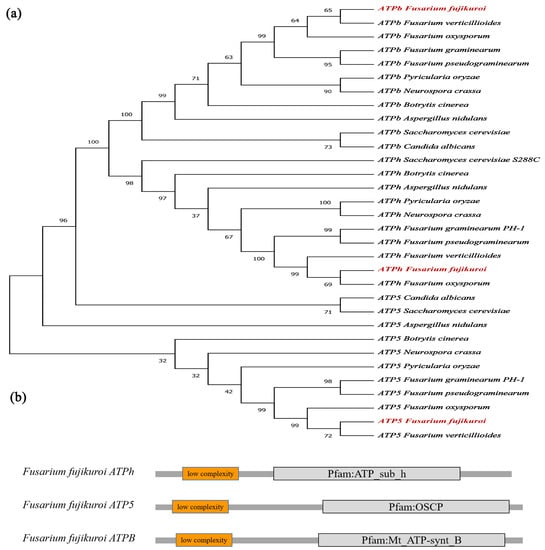 Identification of FfATPh, FfATP5, and FfATPb in F. fujikuroi. (a) Phylogenetic analysis of FfATPh, FfATP5, and FfATPb from Fusarium fujikuroi, Fusarium oxysporum, Fusarium verticillioides, Fusarium pseudograminearum, Fusarium graminearum, Neurospora crassa, Pyricularia oryzae, Saccharomyces cerevisiae, Aspergillus nidulans, and Botrytis cinerea. Amino acid sequences were obtained from NCBI, and MEGA-X was used to construct the phylogenetic tree. The FfATPh, FfATP5, and FfATPb from Fusarium fujikuroi are highlighted in red. (b) The domains of FfATPh, FfATPb, and FfATP5 in F. fujikuroi. A simple modular architecture research tool (SMART) database was used to find the domains.