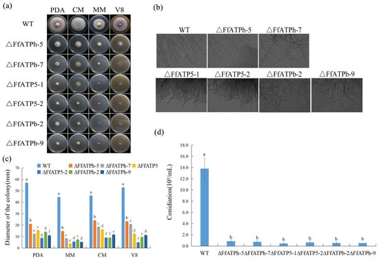Vegetative growth of FfATPh, FfATP5, and FfATPb deletion mutants. (a) The colonial morphology of strains cultured on PDA, CM, MM, and V8 medium at 25 °C for 5 days. (b) The inverted microscope (20×) was used to observe the mycelium tip morphology of strains cultured for 3 days in YEPD liquid medium. (c) The hyphal growth rate of the strains on PDA, CM, MM, V8, and YBA medium. Error bars denote the standard error of three repetitions. LSD method for significant difference analysis; bars with the same letter indicate no significant difference at p = 0.05. (d) The sporulation quantity of A, FfATPh, FfATP5, or FfATPb deletion mutants. Error bars denote the standard error of three repetitions. LSD method for significant difference analysis; bars with the same letter indicate no significant difference at p = 0.05.