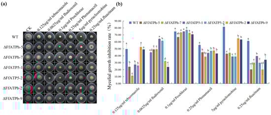 The sensitivity of ΔFfATPh, ΔFfATP5, and ΔFfATPb to different fungicides compared with the WT. (a) Effects of 0.125 μg/mL tebuconazole, 0.0625 μg/mL fludioxonil, 0.1 μg/mL prochloraz, 0.25 μg/mL phenamacril, 5 μg/mL pyraclostrobine, and 0.25 μg/mL fluazinam on mycelial linear growth of ΔFfATPh, ΔFfATP5, and ΔFfATPb mutants. (b) The hyphal growth rate of the strains on PDA supplemented with each fungicide. Error bars denote the standard error of three repetitions. LSD method for significant difference analysis; bars with the same letter indicate no significant difference at p = 0.05.