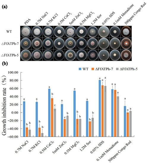 Response of ΔFfATPh to different stress factors. (a) The colonial morphology of different strains on PDA medium with 0.7 M NaCl, 0.7 M KCl, 0.5 M CaCl2, 5 mM ZnCl2, 0.5 M MgCl2, 1.2 M sorbitol, 0.03% SDS, 0.1 mM menadione, and 500 µg/mL Congo red for 7 days. (b) Hyphal growth rate of the strains on different stress factor media for 7 days. Error bars denote the standard error of three repetitions. LSD method for significant difference analysis; bars with the same letter indicate no significant difference at p = 0.05.