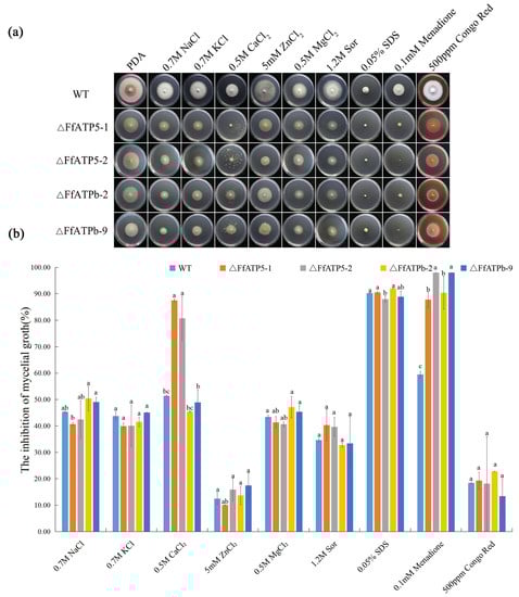 Response of ΔFfATP5 and ΔFfATPb to different stress factors. (a) The colonial morphology of different strains on PDA medium with 0.7 M NaCl, 0.7 M KCl, 0.5 M CaCl2, 5 mM ZnCl2, 0.5 M MgCl2, 1.2 M sorbitol, 0.03% SDS, 0.1 mM menadione, and 500 µg/mL Congo red for 7 days. (b) Hyphal growth rate of the strains on different stress factor media for 7 days. Error bars denote the standard error of three repetitions. LSD method for significant difference analysis; bars with the same letter indicate no significant difference at p = 0.05.