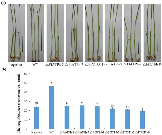F. fujikuroi produces a variety of secondary metabolites (SMs), the most important of which is gibberellin (GA), a hormone that causes rice plants to grow exceptionally long []. To investigate the function of FfATPh, FfATP5, and FfATPb in F. fujikuroi, the wild-type and deletion mutants were inoculated on rice seedlings for 7 days, and the result showed that the length of the rice shoot sheaths was significantly higher than that of the deletion mutants (Figure 6). Combined with the information from previous studies, the mutant strains were unable to produce conidia. Therefore, FfATPh, FfATP5, and FfATPb are essential for pathogenicity in F. fujikuroi.