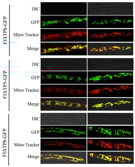 To determine the location of FfATPh, FfATP5, and FfATPb, we added a GFP tag to the C-terminal of each gene and observed the subcellular localization of the gene with a TCS SP8 confocal microscope (Leica TCS SP8, Germany). At the time, the mycelia were stained with Mitro-Tracker (Mitochondrial dye), and we observed the co-localization between each gene and mitochondria. Based on the experimental results, we concluded that FfATPh, FfATP5, and FfATPb are located in mitochondria (Figure 7).