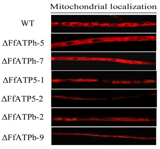 FfATPh, FfATP5, and FfATPb affect the localization of mitochondria. The mycelia of different strains were collected after being cultured in YEPD liquid medium for 36 h. Mitochondria were stained with Mito-tracker (Red fluorescence), and then, the fluorescence was observed with a Leica-TCS-SP8 confocal microscope (100×).