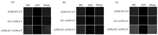 Interaction among FfATPh, FfATP5, and FfATPb. (a) The interaction of FfATPh and FfATPb was confirmed via bimolecular fluorescence complementation (BiFC) analysis. The image was captured under a TCS SP8 confocal microscope at 100× magnification. The strain of ATPh-NT+ATPb-CT displays green fluorescence. (b) BiFC confirmed the interaction of FfATP5 and FfATPb. The image was captured under a TCS SP8 confocal microscope at 100× magnification. The strain of ATPb-NT+ATP5-CT displays green fluorescence. (c) BiFC confirmed the interaction of FfATPh and FfATP5. The image was captured under a TCS SP8 confocal microscope at 100× magnification. The strain of ATPh-NT+ATP5-CT displays green fluorescence.