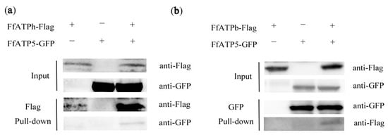 Interaction among FfATPh, FfATP5, and FfATPb. (a) Co-immunoprecipitation confirmed the interaction between FfATPb and FfATP5. (b) Co-immunoprecipitation confirmed the interaction between FfATPh and FfATP5.