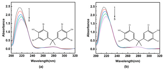 Upon increasing the concentration of TBBPA/TCBPA, a notable decrease in the intensity of the characteristic absorption peak at 215 nm of HSA is observed, accompanied by a redshift. This observation suggests that TBBPA/TCBPA can bind to HSA, and this bind process change is conformational in the peptide chain of HSA [29,30]. Furthermore, a slight decrease is observed in absorbance at 280 nm, indicating the exposure of aromatic amino acids to a more polar environment [31]. Although the shape of the maximum peak at 280 nm remains largely unchanged, these findings revealed HSA can interact with TBBPA/TCBPA, leading to the formation of TBBPA/TCBPA–HSA complexes.