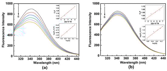 To account for the ligand concentration in the study system, which was much lower than the 10−5 M level, the inner-filter effect of the ligand was neglected. The Stern–Volmer equation and double logarithmic equation (Equations (1)–(3)) were used to analyze the data of fluorescence spectra. Thermodynamic parameters were obtained using Equation (4) to determine the driving forces in the binding process.